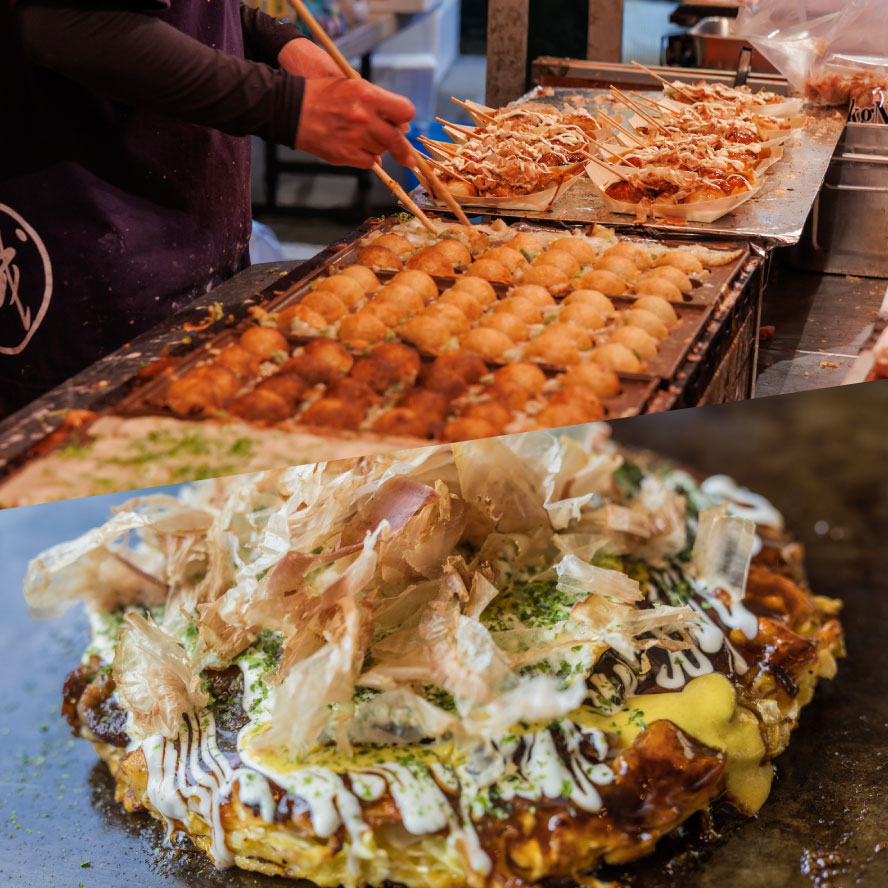Flour-based dishes like takoyaki and okonomiyaki are soul foods that symbolize the Kansai region. Their appeal lies in being affordable and delicious, enjoyed alongside the lively atmosphere of the city streets.