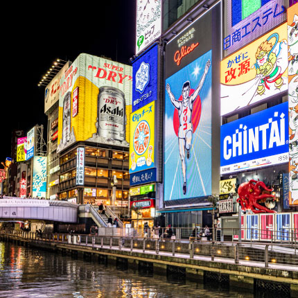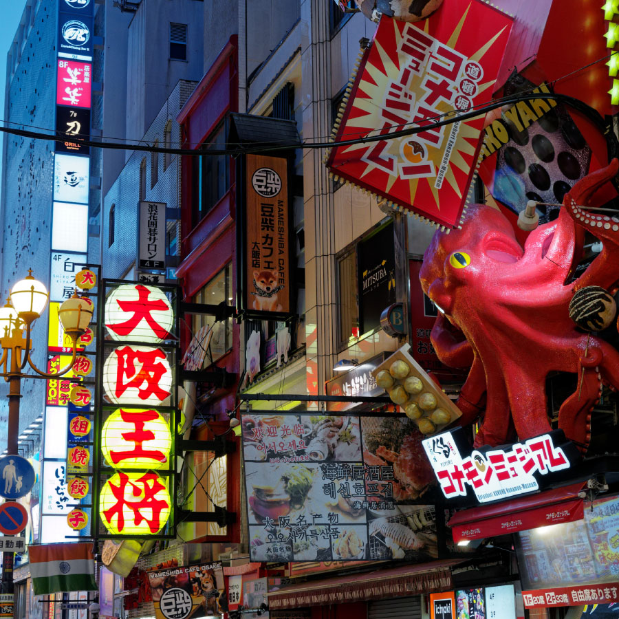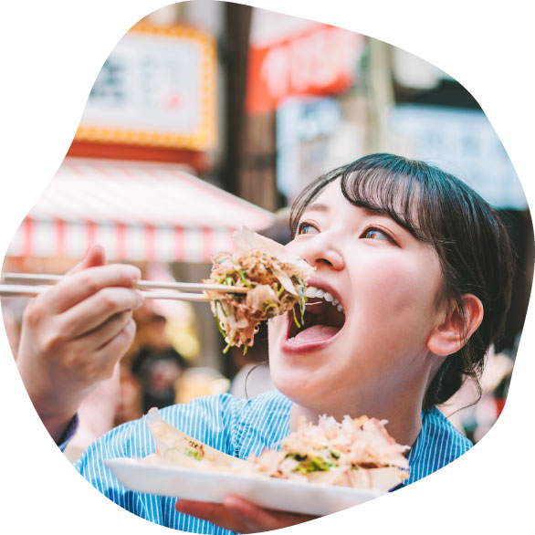 First, visit the symbol of history, Osaka Castle. In the afternoon, check out the latest trends in Shinsaibashi. At night, under the giant neon signs of Dotonbori, hop from one place to another enjoying authentic takoyaki and okonomiyaki, immersing yourself in Naniwa's food culture.