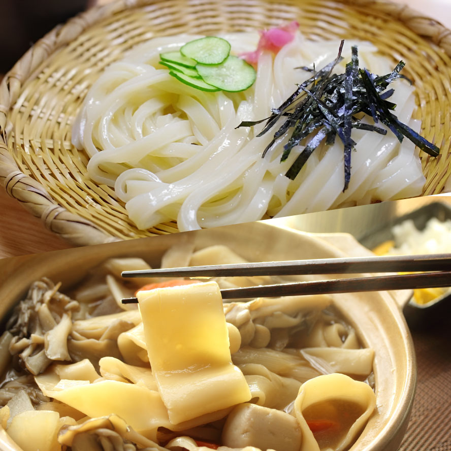 Surrounded by mountains such as the Jomo Sanzan (Mount Akagi, Mount Haruna, and Mount Myogi), Gunma Prefecture has developed a unique food culture that makes use of wheat and vegetables. Mizusawa udon, with its smooth texture and firm texture, is considered one of Japan's three great udon noodles. Okkirikomi, made by simmering wide noodles with vegetables in miso and soy sauce, is a typical local dish that has warmed people living in the cold mountains. Gunma Prefecture is also the number one producer of konjac in Japan, making use of its abundant water resources, and is known for its healthy and simple mountain produce.